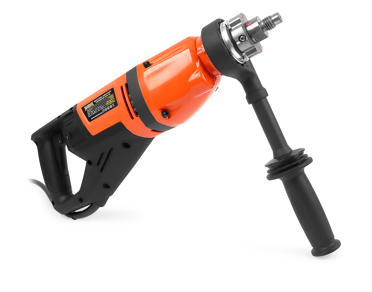 Электродвигатель мощностью 2000 Вт гарантирует стабильную производительность при использовании коронок диаметром от 30 до 150 мм. Двухскоростной редуктор с показателями 1200 и 2100 оборотов в минуту обеспечивает снижение скорости вращения без ущерба для мощности.