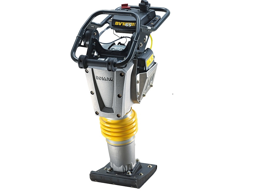 Вибротрамбовка BOMAG BVT 65 предназначены для ударного уплотнения всех типов грунта. В отличии от виброплит и катков отлично справляется со связанными грунтами, удобная при работе в траншеях, узких пространствах. Имеет большую глубину уплотнения. Передаточный механизм работает от привода (двигателя) через центробежную муфту, шестерни, кривошипно-шатунный механизм, шатун, направляющий поршень, двойную систему пружин и пружинный цилиндр на трамбующий башмак. Муфта цепляется при ускорении.